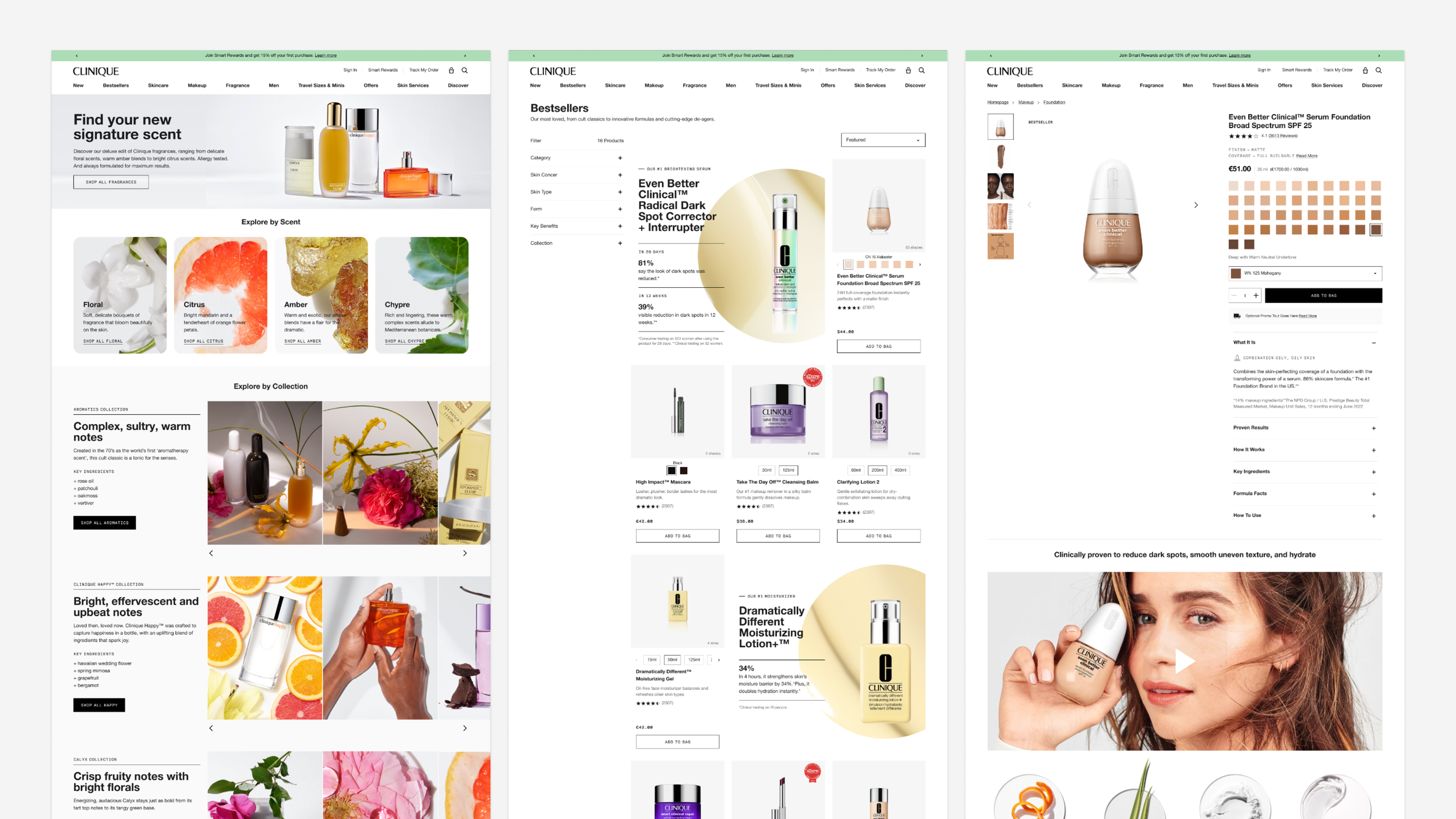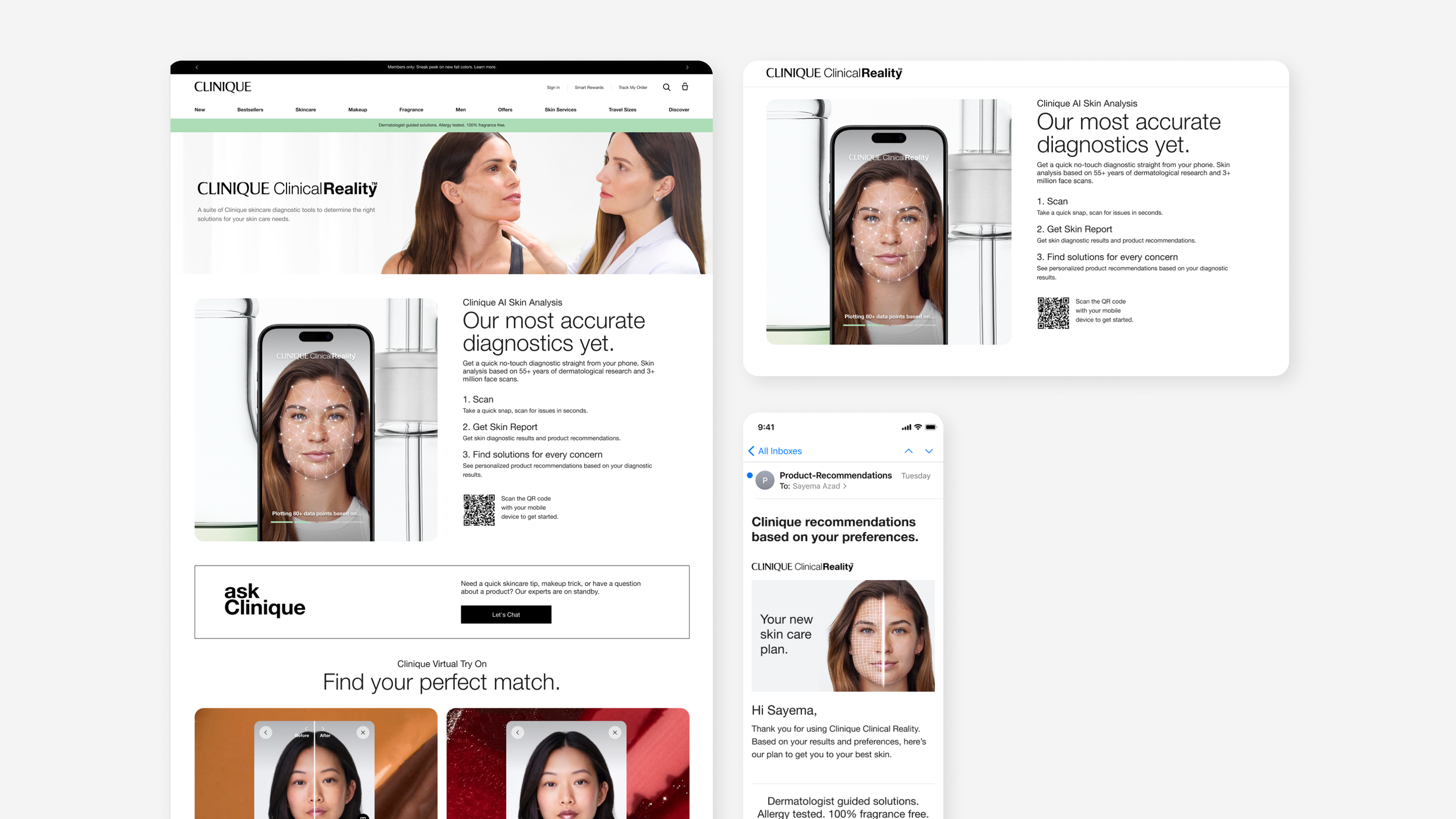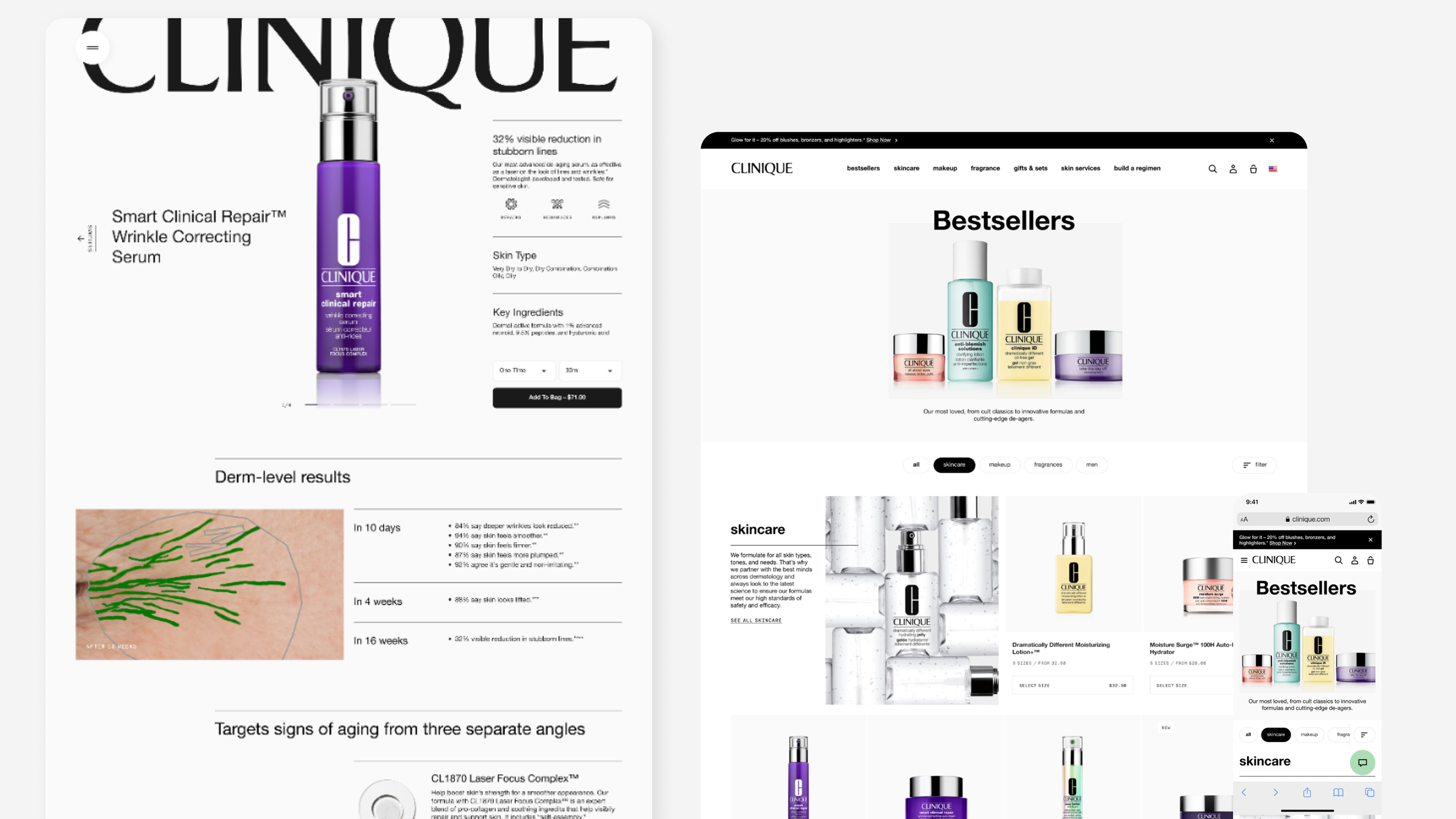 In collaboration with Clinique brand & ecommerce team, created new user flows, concepts, and designed new templates for in-store iPad, customer mobile web, and supporting Clinique Clinical Reality web pages, modules, and email.