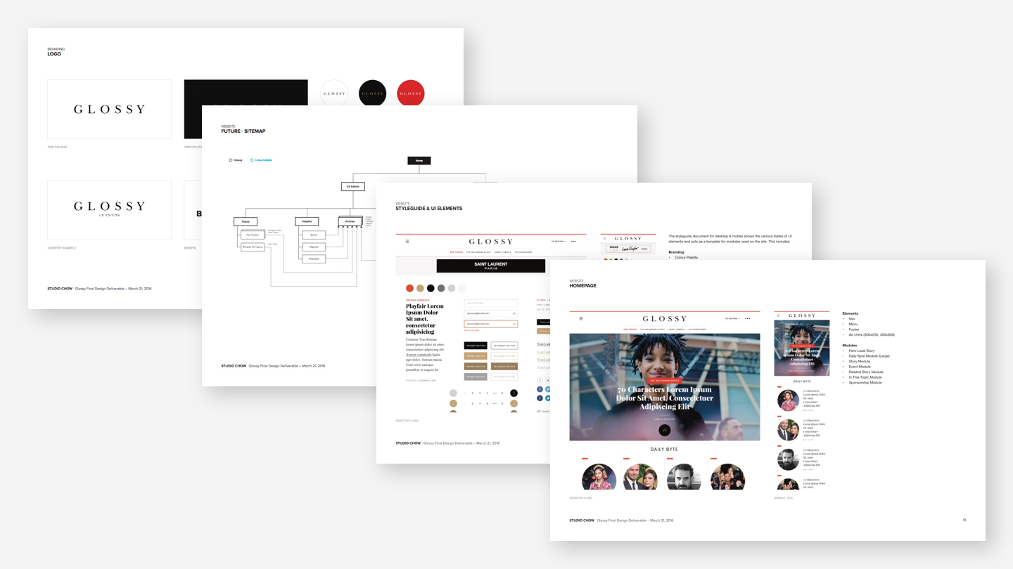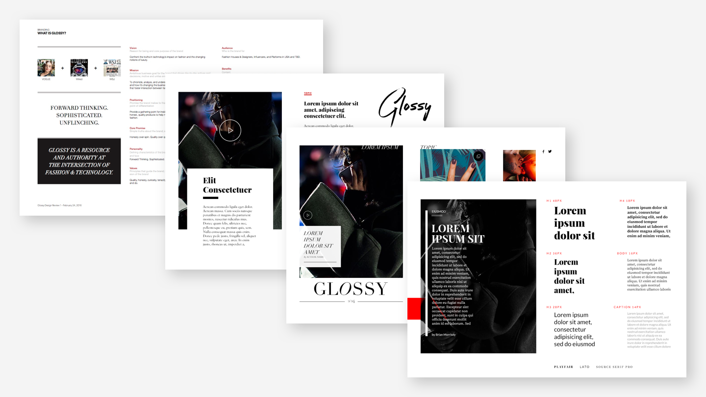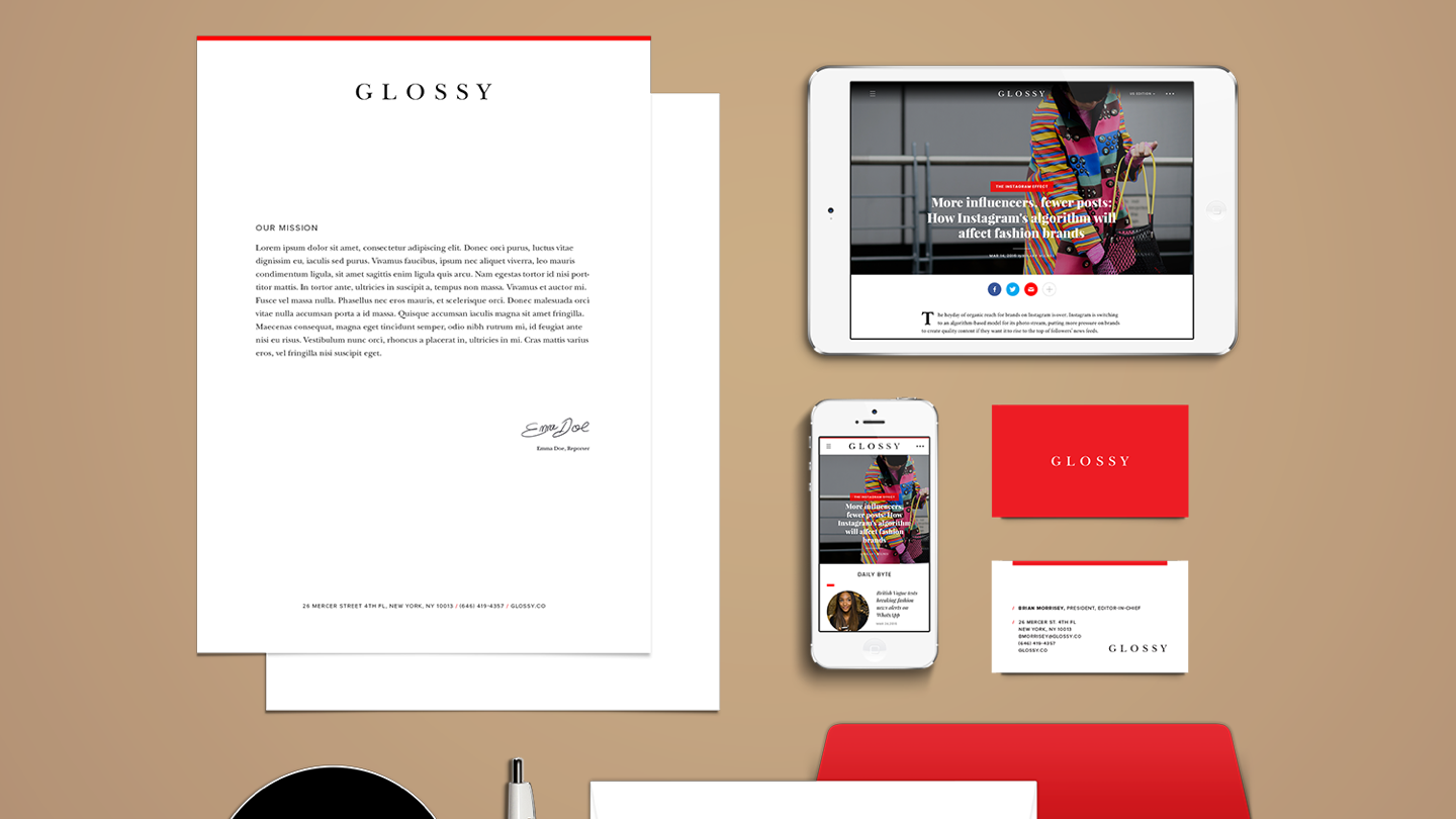 Working with Digiday's CEO Nick Friese and editor-in-chief Brian Morrissey to define Glossy's branding including the brand's mission, core promise, audience, personality, and its relationship to the Digiday masterbrand. In addition, create a brand identity that is fashion industry focused.
