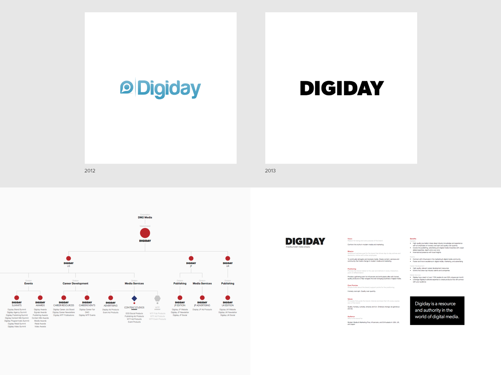 Studio Chow's relationship with Digiday Media began with the visual identity redesign and editorial integration for the Digiday website in 2011. Working with the CEO and editor-in-chief, refined the brand's mission, core promise, audience, personality, and its relationship to the Digiday masterbrand. In addition, designed the visual identity used for web, print, and events.