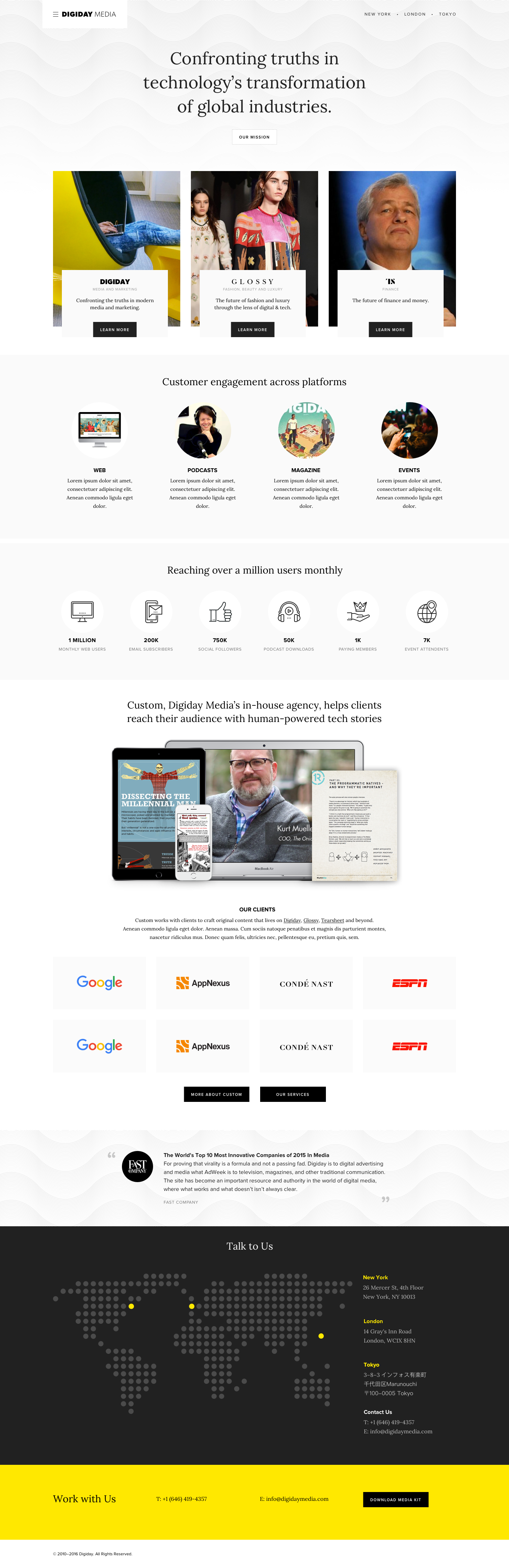 Studio Chow's work with Digiday Media began in 2013 with the rebranding and site redesign of Digiday, marking its transformation from an event company into a publisher business. The company has since grown into a global media powerhouse with a monthly reach of 1 million users across it’s media brands.